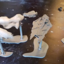 For the debris fields, it was a bit more complex. I made two pieces, one a CR90 Corvette, and one a Gladiator Star Destroyer. Both suffered battle damage thanks to a wood burning tool melting the 3d printed plastic. In the case of the Gladiator, I fully separated a section, and then re-attached with a short bit of plastic wire. Although both could likely use a bit of paint, the models work very well as is.