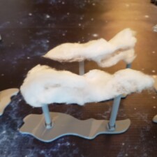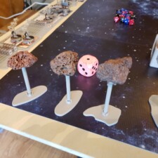 Finally sat down to finish up the 3d scenery for Armada, in preparation for playing the game. The asteroids turned out pretty decent, a bit of hot glue attaching them to the support poles worked fairly well. For the nebulas, I used a cotton ball stretched (and glued) between two support poles. The space station I had already previously posted.